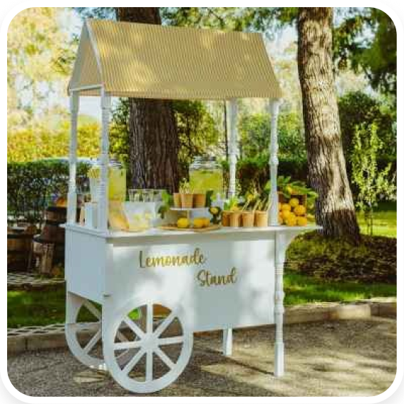 Στήνοντας αυτό το υπέροχο ξύλινο κάρο – κιόσκι (old fashioned). Το Lemonade Stand μπορεί να χρησιμοποιηθεί επίσης για να προσφέρουμε, βυσσινάδα, fruit punch, παγωμένο τσάι αλλά και διάφορους χυμούς της αρεσκείας σας..!!! Συνδυάστε το lemonade Stand με το καροτσάκι παγωτού , το καροτσάκι ποπ-κορν ή το καροτσάκι με μαλλλί της γριάς..!!!!